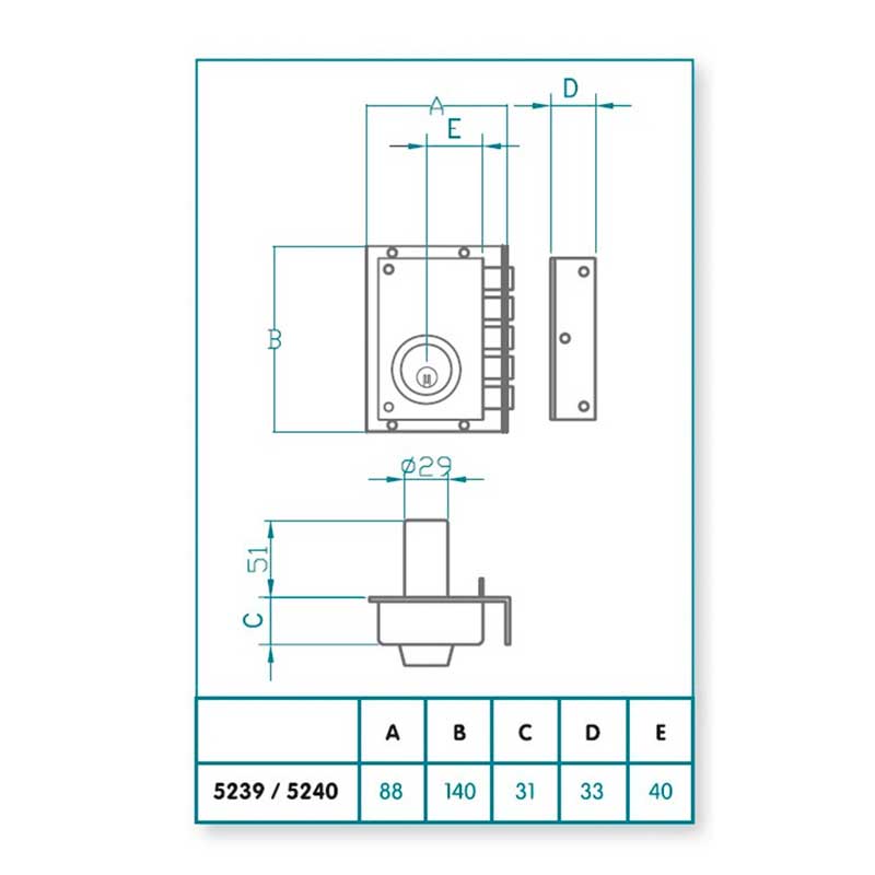 Cerradura  de sobreponer de seguridad JIS 5239 modelo no reversible a elegir mano derecha o izquierda con 5 llaves de alpaca de doble dentado y  cilindro fijo de 51 mm de alta seguridad. Con casquillo giratorio antipresa y antipalanca, cilindro antitaladro, corrector de ajuste del nivel de la puerta y más de 40.000.000 de combinaciones. Cerradura JIS 5239 de máxima seguridad de sobreponer y embutir con cinco pestillos de acero inoxidable de dos vueltas.