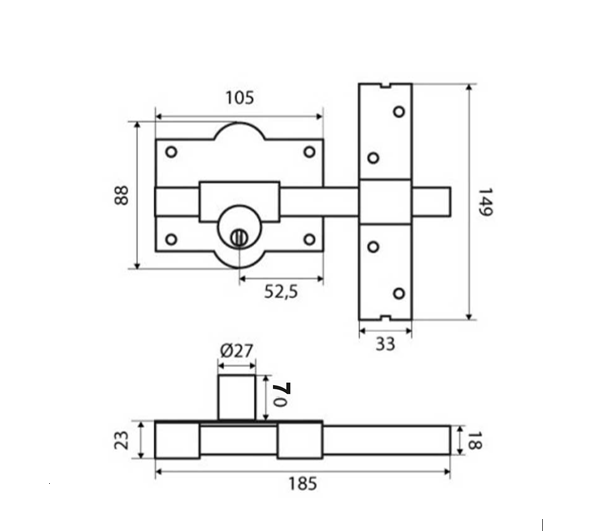 Nuevo cerrojo INTHER 1101L/105 70mm Pintado especialmente versátil y utilizado en el sector domestico. De fácil instalación y apto para todo tipo de puertas aportando seguridad y garantía.