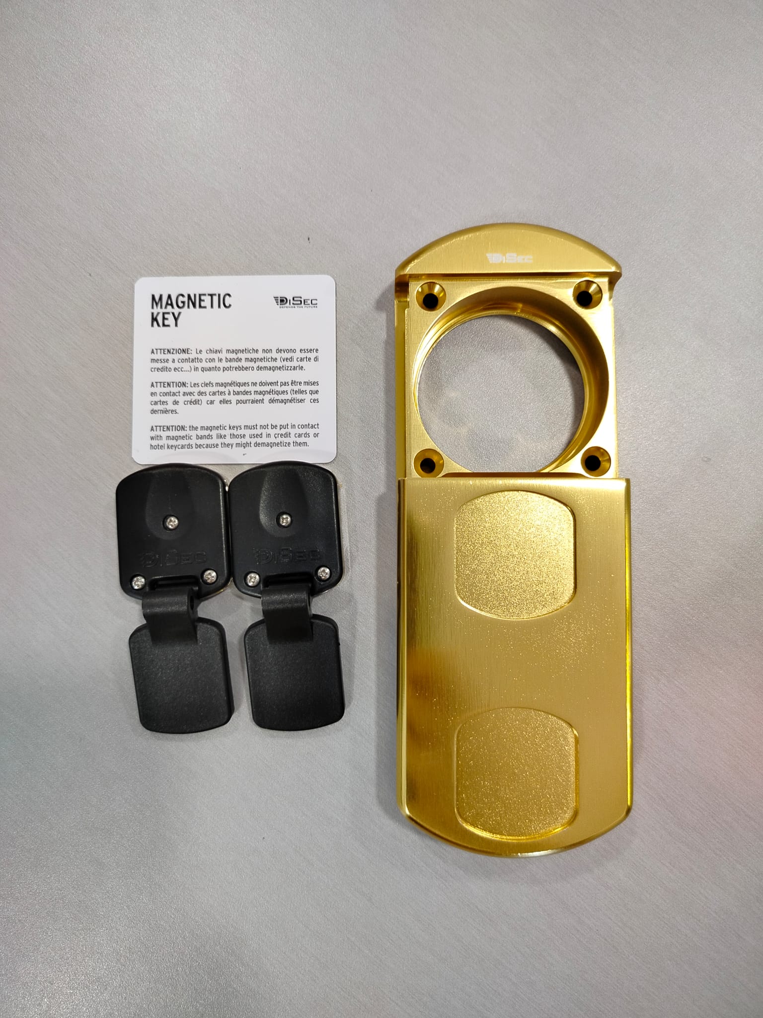 Escudo de seguridad magnética Disec para la protección y/o control de accesos en acabados en dorado o plata.