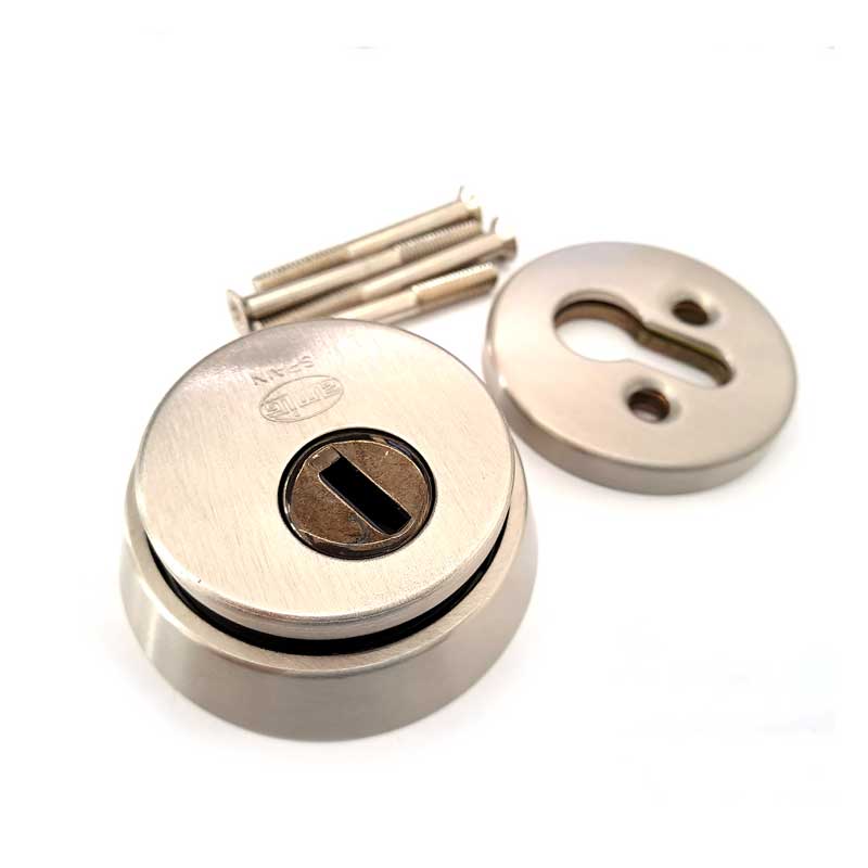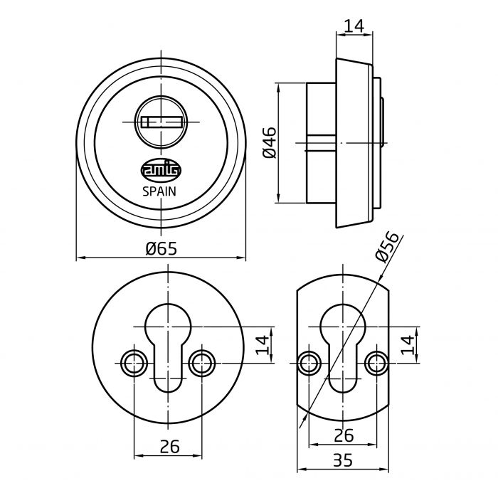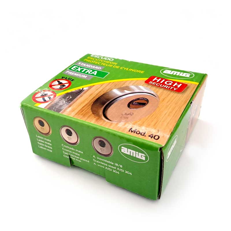 Escudo AMIG 40 Ø65mm de alta seguridad con cuerpo de acero sinterizado, placa antitaladro de acero carbonitrurado fijada con tuercas antirrobo carbonitruradas. Anillo exterior macizo. Rodamientos de acero templado antitaladro en el cuerpo. Incluye dos juegos de tornillos de fijación de alta resistencia para puertas de 40 y 45 mm de ancho y un bocallave. Para puertas con grosor mínimo de 40 mm y cerraduras AMIG o similares.